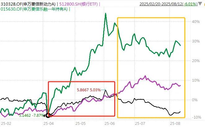 对比净值走势,2025年1季度末,贾成东重仓银行,截至6月中旬“申万菱信新动力”的走势也和“银行ETF”差不多。
