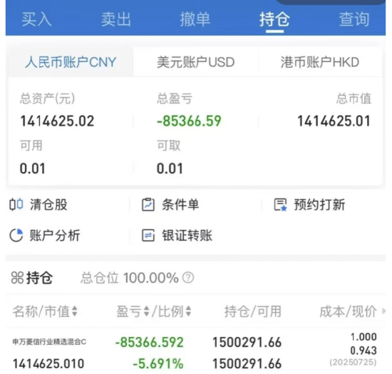 8月13日,一位申购150万元申万菱信行业精选的投资者,曾经的持仓截图曝光: