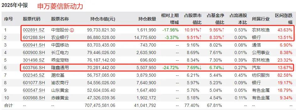 中宠股份是第一大重仓股,2025年1季度就开始重仓了,还有农业银行、隆鑫通用,都是1季度开始重仓,二季度也有不错表现,2位数涨幅。其他几只新进入十大重仓股的票,也全部都是红的。